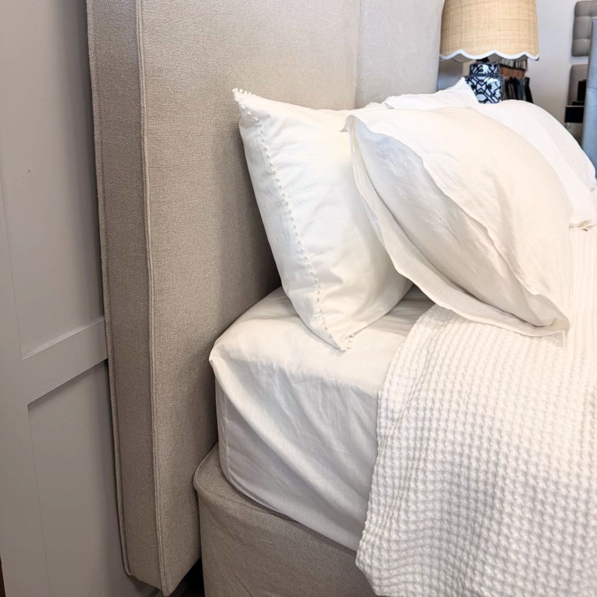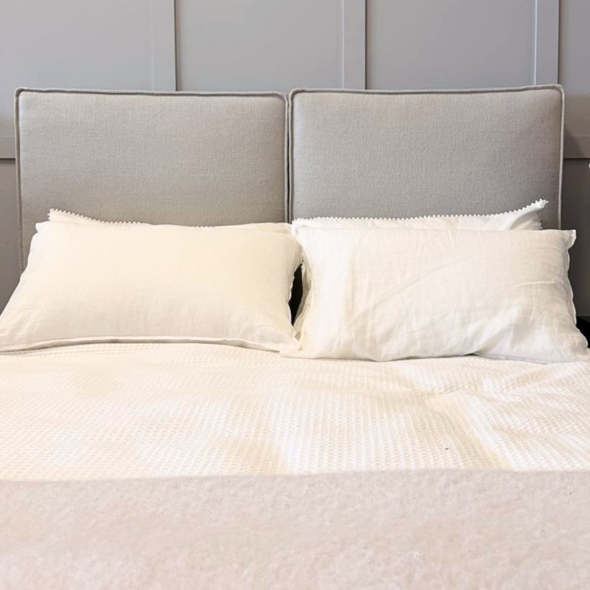Queen Armelle bedhead in Milla Whisper linen
